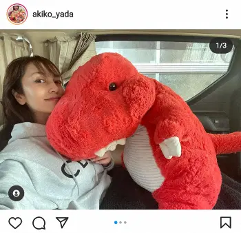 矢田は「最近、コストコで久しぶりに買ったぬいぐるみ」とつづり、赤い恐竜のぬいぐるみを抱えた写真などを投稿。さらにハッシュタグを付けて「移動中には抱えて寝ています」「一度会計を済ませた後やっぱり欲しくなってこの子だけ買いに走った」「抱き心地最高 移動中はスウェット上下」などと付け加えた。