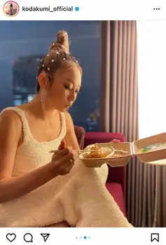 「おいスイートでスゥーの瞬間」とつづり、窓から美しい夜景が見える部屋で弁当を食べる姿の写真をアップ。倖田は上下モコモコの服を着用。トップスは、大胆に肩を露出したデザインとなっており、きれいなデコルテをあらわになっている。「素敵なところで、撮影の合間お弁当いただきました!」と記した。