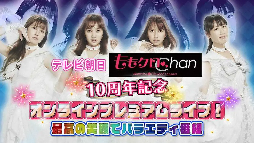 テレビ朝日が運営する動画サイト「テレ朝動画」で配信されている、ももいろクローバーZの冠番組『ももクロChan』は今年10周年。これを記念して番組初となるオンラインイベント「テレビ朝日 ももクロChan 10周年記念 オンラインプレミアムライブ!~最高の笑顔でバラエティ番組~」を11月6日(土)に開催。歌あり、コントあり、バラエティ企画あり、ここでしか言えないトークなど、全ての人が楽しめるTVショーを送る。