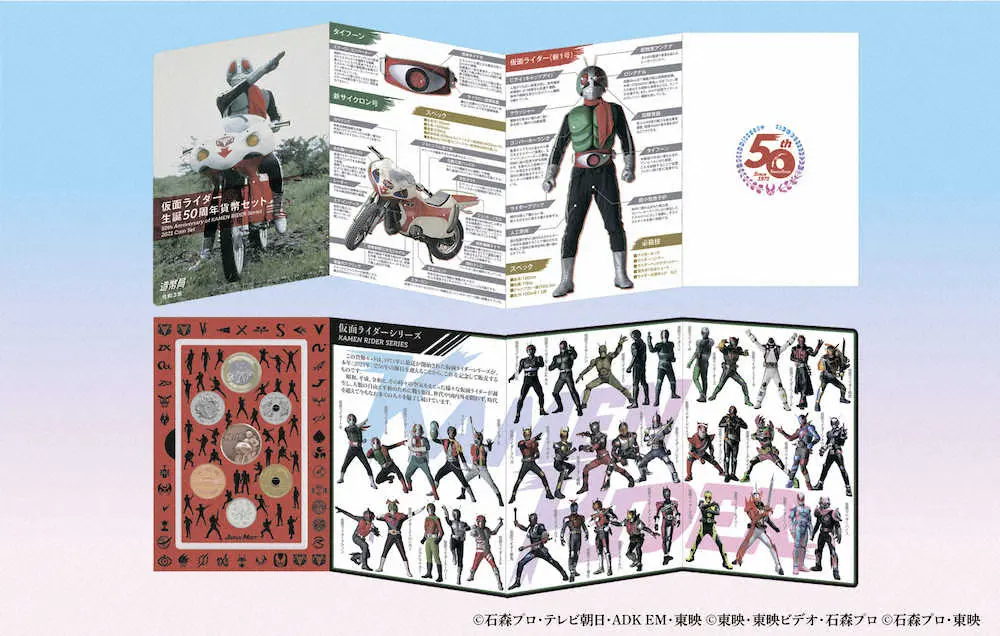 新サイクロン号にまたがる姿をあしらったメダルを含む貨幣セットは2700円(送料込み)で7万セット。造幣局のオンラインショップか、はがきで申し込める。申し込み多数の場合は抽選。一部はJR東京駅地下街にある「仮面ライダーストア」でも来年1月ごろに販売する予定。