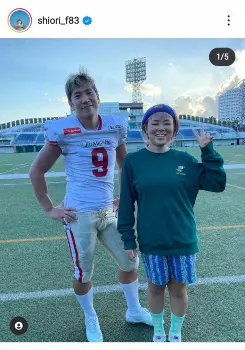 「ブルゾンちえみ」の芸名で活動していたタレント、藤原しおり(31)が11日、自身のインスタグラムを更新。元お笑いコンビ「ブリリアン」のメンバーで俳優、アメリカンフットボールXリーグ「X1エリア」、イコールワン福岡SUNS選手のコージ・トクダ(33)の試合を見に行ったことを報告し、2ショットを公開した。