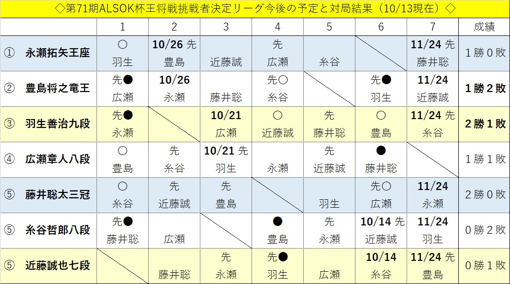 王将リーグは、前期挑戦者の永瀬拓矢王座、前期リーグ残留者の豊島竜王、羽生九段、広瀬章人八段、2次予選通過者の藤井3冠、糸谷哲郎八段、近藤誠也七段の7棋士による総当たり戦。11月24日の最終一斉対局を終えた時点での成績最上位者が、来年1月開幕予定の7番勝負で渡辺王将に挑む。