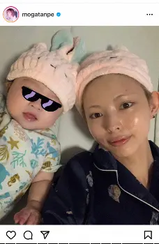 「タオルキャップおそろい。お風呂上がりのドライヤー時短用~こも氏はすぐ乾いててめっちゃ良いこれ」とつづり、娘とおそろいの可愛らしいピンクのタオルキャップをかぶって寄り添う仲良しショットを公開した。