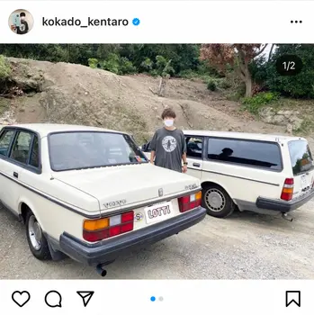 「セダンとワゴン」とつづり、愛車のボルボ「240GL LIMITED」とのツーショットを投稿。コカドは「ボーンホワイト」と呼ばれる白を基調とした車体の横に立っており、ハッシュタグでは「#volvo240#ボルボ240#ボーンホワイト」と記した。
