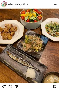 「玲子飯。さんま登場~!旬のものはやはり美味しいですね。焼き茄子に里芋の唐揚げ、大根の葉とちくわの炒め物。お味噌汁にサラダと野菜中心のメニューでした」とつづり、秋の味覚さんまや、野菜がたっぷり使われた手料理が並んだ食卓を披露した。