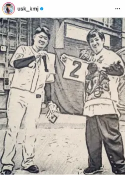 さらに、松坂が「1」、上地が「2」と書かれた背番号を持ち笑顔を見せる加工した写真をアップしたうえで「#名球会に入れなかった『1』番 #すぐ野球辞めちゃった『2』番 期待に沿えなくて本当にすいませんでした」とつづった。