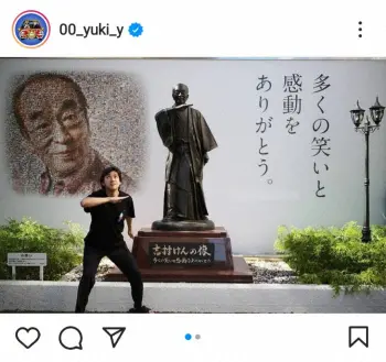 山田裕貴 志村けんさん役への思いつづる「皆さんに感動と笑いを」 銅像とともに「アイーン」ポーズ