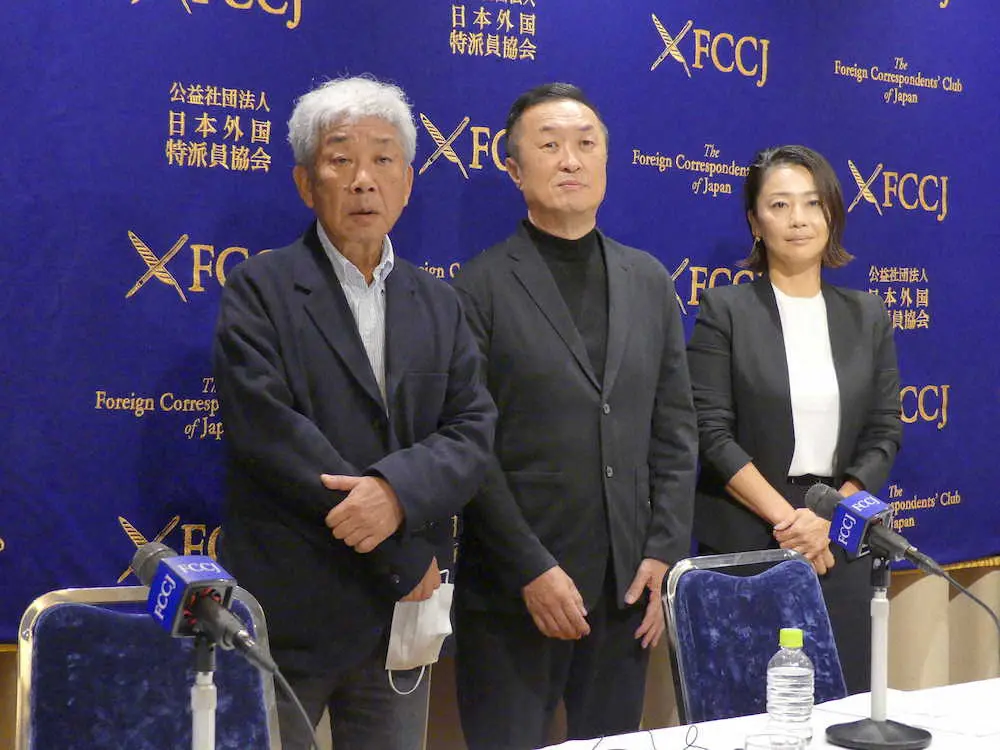 会見する大崎吉本興業ホールディングス会長(左)ら