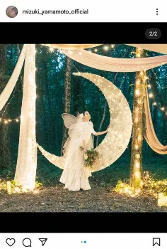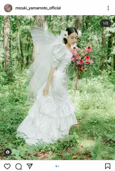 20日に披露した王冠のようなティアラをつけたドレス姿に続き、この日は山本の母が結婚式で着たドレスをリメイクしたものを着用。「モンシロチョウになりたくて、羽も作って頂きました」とつづり、白い羽を付け、花束を持ったショットを公開した。