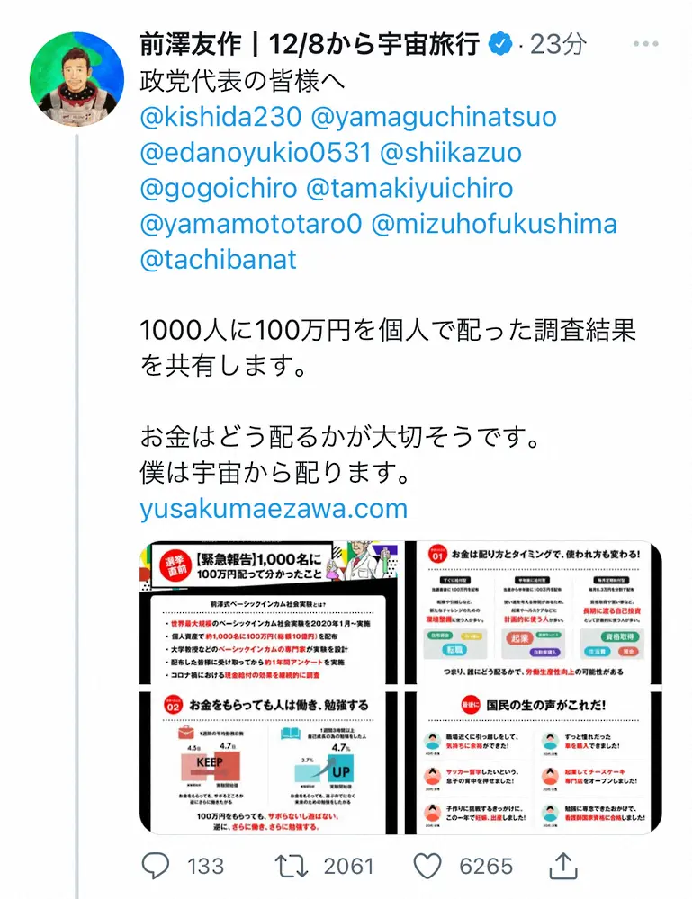 前澤友作氏 Photo by スポニチ 前澤友作氏 “お金贈り”に関する見解を各党に向けて表明 「お金はどう配… ギャラリーで見る この記事のフォト 2021年10月26日の画像一覧 もっと見る 2021年10月26日の画像をもっと見る