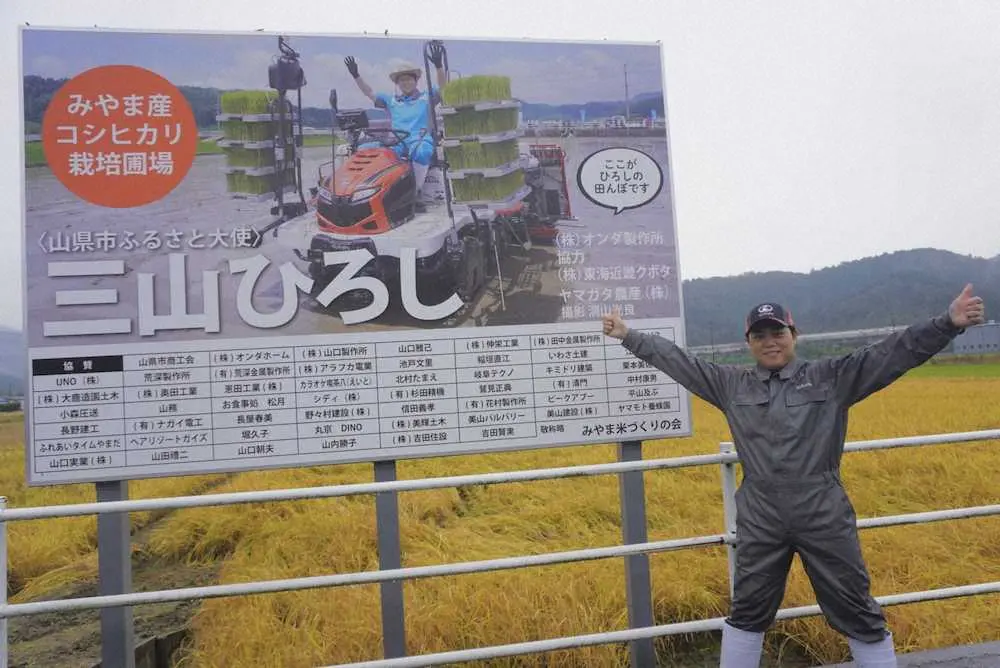 岐阜県山県市美山地区で自身の名を冠した「みやま産こしひかり三山米」の収穫を行った三山ひろし