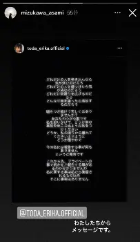 一部の週刊誌で、女優の戸田恵梨香(33)と不仲説が報じられていた水川。この日は、ストーリーズの機能も更新し、戸田がアップした週刊誌への訴えを投稿。「わたしたちからのメッセージです」と添えた。