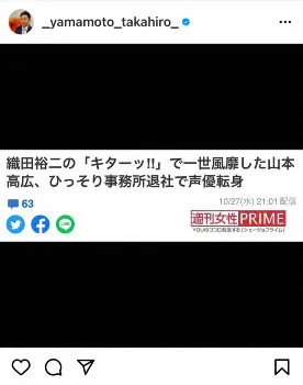 山本は同日夜に配信された「週刊女性PRIME」の「織田裕二の「キターッ!!」で一世風靡した山本高広、ひっそり事務所退社で声優転身」というタイトルの記事の画像を投稿したうえで、「ちょっと笑っちゃったよ『室井さん どうして芸人辞めなきゃいけないんだ』」と得意の織田裕二(53)でおなじみのものまねのフレーズを使って反論。「それに芸能事務所関係者 声優事務所関係者 テレビ局関係者 芸人仲間 誰だよ」と記事中に登場する“関係者”の存在を否定し、「嘘ばっか『ナメてんだろ 来いよ~』僕は芸人友達い~ま~せん!!」と抗議した。