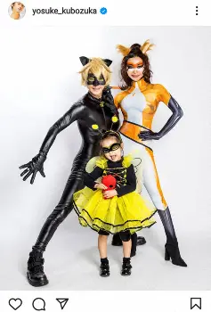 これまで「トイストーリー」「テレタビーズ」「ピーターパン」などの全力ハロウィーンコスプレを披露し、話題となってきた窪塚。今年のテーマは人気アニメ「ミラキュラス」で、「毎年恒例のハロウィンコスも、もはや娘へのボランティア 2021年は娘の好きなアニメ『ミラキュラス』でございます」と窪塚。窪塚がシャノワール、妻でレゲエダンサーのPINKYがリナルージュ、長女・あまとちゃんはクイーンビーに扮してポーズを決めている。俳優、モデルとして活躍中の長男・窪塚愛流(18)も昨年までは参加してきたが、今年は「※息子は超多忙につき欠席」と説明した。