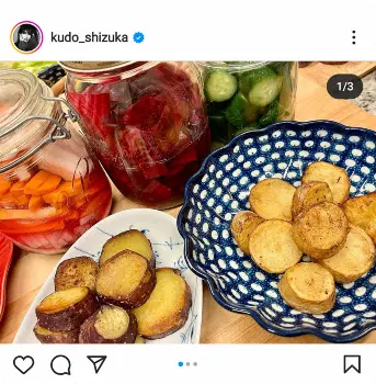工藤は普段から大量の干し芋を持ち歩くなど、“芋好き”を公言し、この日も「秋はお芋さんたまらないですぅ。お芋はオールシーズン好きですが、、、」とつづり、輪切りにしたじゃがいもとサツマイモの2皿の写真を投稿。「じゃがいもはオリーブオイルとハーブ塩。薩摩はココナッツオイルとハーブ塩。蒸してから少し多めの油で表面をカリッとさせると、もうたまらないんですぅ おやつに最高ですね!」と説明した。