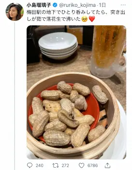 「梅田駅の地下でひとり呑みしてたら、突き出しが茹で落花生で沸いた」とつづり、茹でた落花生の奥にビールがみえるひとり呑み最中のショットを投稿。続けて、千葉県出身の小島は「落花生は茹でが一番美味しい。(千葉県民どやぁ)」と記した。