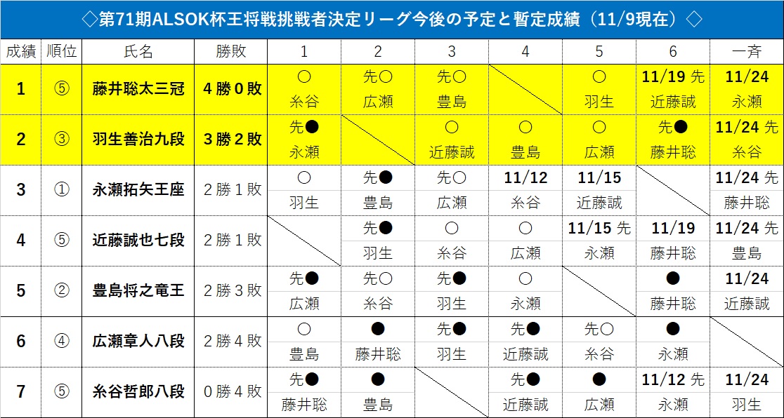 第71期ALSOK杯王将戦挑戦者決定リーグ今後の予定と暫定成績