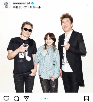 今月7日に行われた「相川七瀬 25th Anniversary Final Party ~ROCK NEVERLAND~」で布袋や織田と共演したという相川。「この間の終演後の写真です。奇跡の3ショット。生涯大切にします」とつづり、2枚の写真を投稿。1枚目には相川を真ん中にして、布袋と織田が笑顔で寄り添う3ショットを、2枚目には小柄な相川と187センチと高身長の布袋が並んだ身長差のある2ショットをアップした。