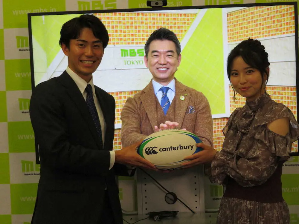 出演陣が一新された「全国高校ラグビー大会ハイライト」の取材会で意気込みを語る(左から)三ツ廣政輝アナ、橋下徹氏、木下彩音