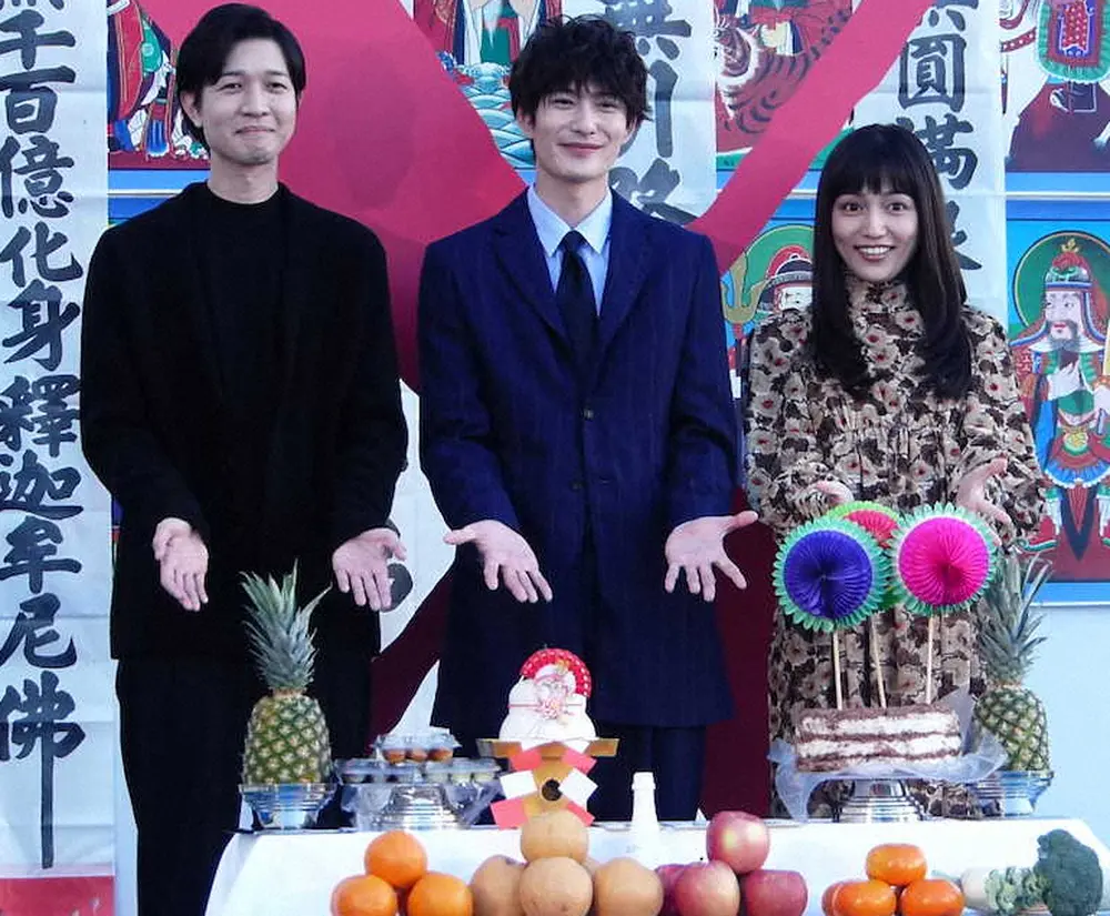 映画「聖地X」のヒット祈願イベントに出演した(左から)薬丸翔、岡田将生、川口春奈