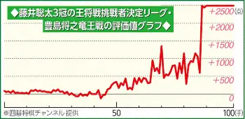 グラフは囲碁将棋チャンネルによる形勢の振れ具合を示した一例。画面上ではこの評価値に基づき、パーセンテージで示す両者の形勢について0~200点有利が50~55%、200~500点は55~60%、500~1000点は60~75%などと表示される。この日、日本将棋連盟が運営する中継アプリの評価値は、藤井が中終盤で一時的に40%台前半まで下げることもあったが「藤井不利」までは至らなかった。