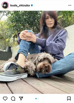 愛犬と一緒に写った写真を載せて「まだまだ行けない 早くお散歩に行きたいね」と投稿。「トレーナー @bape_japan」「シューズ @bape_japan×@vansコラボレーション」とつづり、人気ブランド「A BATHING APE」と「vans」のコラボ迷彩スニーカーを履き、薄紫色のトップスとジーンズで合わせたラフな格好を披露した。