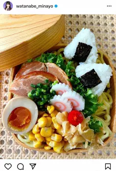 日頃から手料理や、自身の子供たちの弁当の数々を公開している渡辺。この日は「次男くんのリクエストのお弁当」とコメントし、高校生の次男のために作ったという「つけ麺弁当」を公開。弁当箱には色とりどりの具材が丁寧に並べられており、小さなおにぎりが添えられているのも見える。