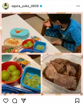 3人の息子を持つ小倉。「今日は、次男の5歳のお誕生日。お誕生日の日は何を食べたい?と聞いたら『シャインマスマスカット~!!』と。朝ごはんにも食べて、お弁当にもシャインマスカットを入れました。起きたらシャインマスカットがあり、嬉しくてお弁当から一個食べた次男笑。朝から喜んでもらえて良かった。今日は、チャーシューのお弁当でした」とつづり、次男がマスカットを食べる姿と、柔らかそうなチャーシューが入った手作り弁当を披露した。