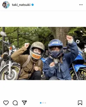 この日はバイクのツーリングや、キャンプなどのアウトドア系の動画を「独ヲタ女子『アッキーch』」に投稿しているアッキーとツーリングを楽しんだという滝。「念願のアッキー(@dokuota_akkie)とツーリング」とコメントし、2台のバイクを背景にヘルメットを被った姿でアッキーとの2ショットを披露。「いつも見てるチャンネルだから勝手に前から知ってる友達みたいな気持ちで(図々しい笑)あっという間の時間でした」と振り返った。