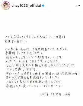 「これからも私らしく日々精進して参りますので、今後とも応援していただけますと幸いです。2021年11月30日 chay」と記した。