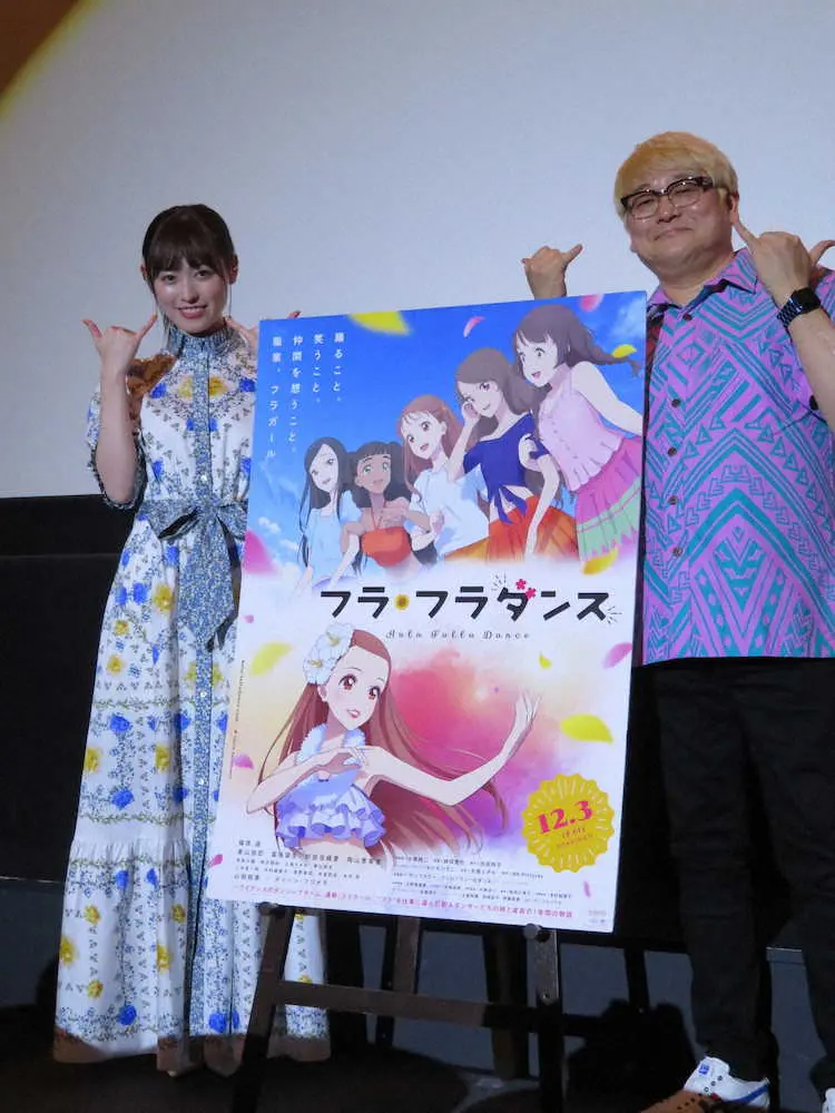 同映画は福島県いわき市に実在するスパリゾートハワイアンズを舞台に、新人フラガールの奮闘と成長を描くアニメ。すでに祖父母が映画館で鑑賞してくれたそうで「“涙こらえるの必死だったよ~”と言ってくれてうれしかった」と笑顔を浮かべ「とっても前向きになれる温かい作品」とPRした。