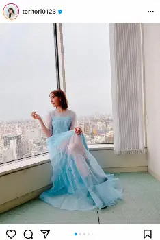 「水色ってやっぱり好きだなぁ。FARFETCHのドレスに、e.m.のアクセサリー」とつづり、華やかな水色のロングドレスに身を包み、窓際に腰掛けるショットをアップ。ドレスはシースルー素材となっており、チラリと美脚をのぞかせた。