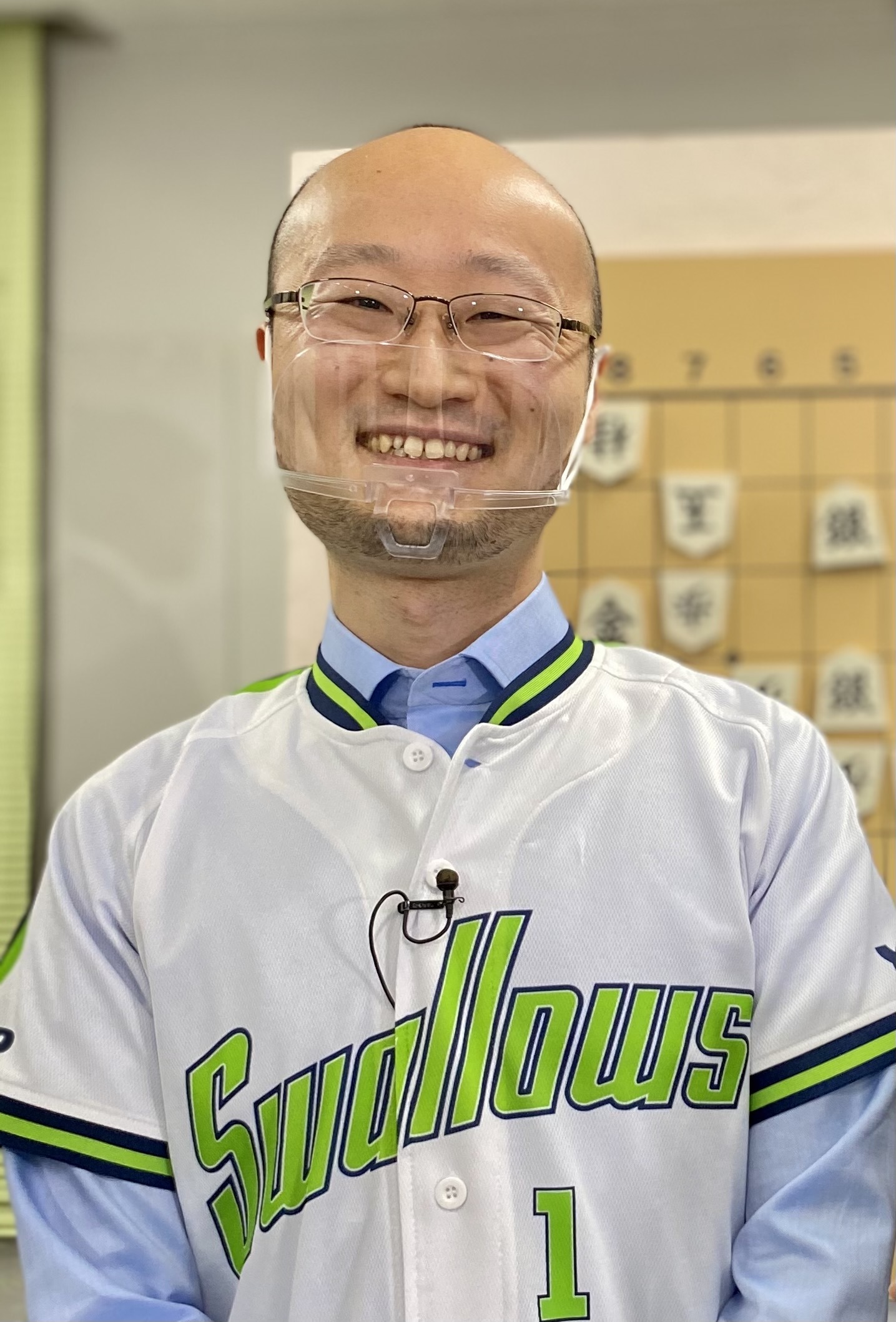 自前のヤクルトユニフォームに身を包み笑顔の渡辺明王将(名人、棋王との3冠)