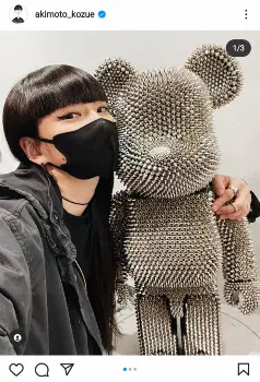 秋元は、9日まで都内で開催されていたベアブリック誕生20周年を記念した展覧会にアーティストの一人として手作りの作品を出品した。様々な大きさのスタッズで全身を覆った作品に仕上がっており、秋元は英語で「自分で全てのスタッズを付けた #studs #10mm #8mm #6mm #3mm 」と説明。ツイッターでは「My baby(作った本人なので肩抱いてますが、本来は触れません)」ともつづっている。