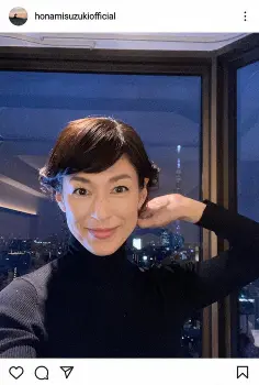 鈴木は東京スカイツリーをバックに黒いタートルネックセーター姿の写真を投稿。「メイクの京子さん曰く『オードリー・ヘップバーンを作ったつもり』うひょひょ」とつづった。