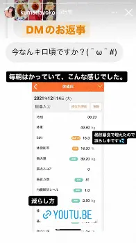 この日はストーリー機能で、フォロワーからの質問に回答。「今なんキロ頃ですか?」との質問に、「毎日はかっていて、こんな感じでした」と「時刻6:29 体重49・801㎏ BMI18・3 体脂肪率16・20% 筋肉量39・20㎏」などと記されたアプリの画面のスクリーンショットを公開した。