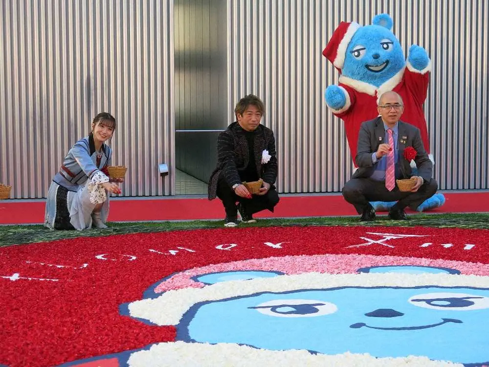 インフィオラータはイタリア語で「大地をキャンバスに花びらで描くアート」という意味。赤、白、ピンク3色のカーネーション1万本分の花びらなどで描かれたサンタクロース姿の「あべのべあ」が大阪で最も高い天空庭園に飾られた。