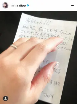 わたなべは「JOY君のこーゆーところ好き 仕事の為朝の5時過ぎにこっそり家を出たJOY君。娘と共に朝起きたらリビングのテーブルの上にお手紙が置いてありました」と、置き手紙の写真を投稿。公開された手紙には「麻衣ちゃん!!!毎日毎日、家のこともはーちゃんのこともやってくれてありがとう!」などと記されている。