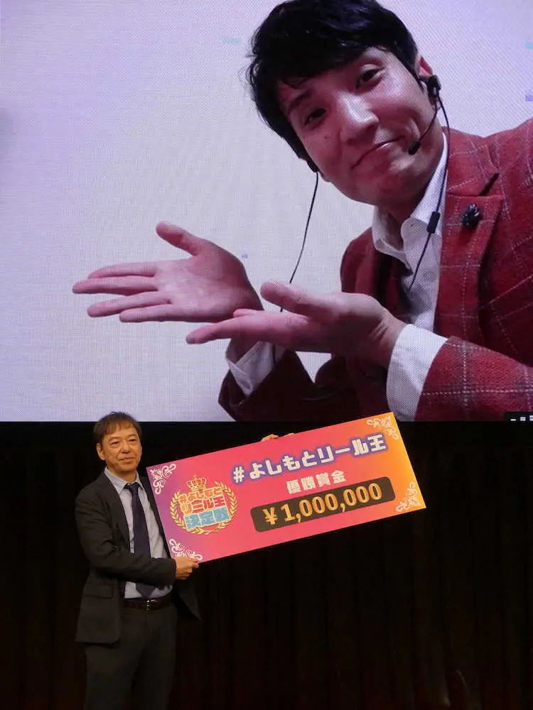 「第2回#よしもとリール王決定戦」で優勝した「ソラシド」の本坊元児(後方のスクリーン)。審査員長の板尾創路から賞金100万円を授与された