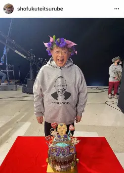 独特な鶴瓶のイラストがデザインされた大きなケーキを前に、“70TH ANVSRY”の文字と鶴瓶の写真がプリントされたパーカートレーナーを着て満面の笑み。後ろに写り込むスタッフと思われる男性も同じトレーナーを着用しており、温かい雰囲気が伝わる1枚になっている、
