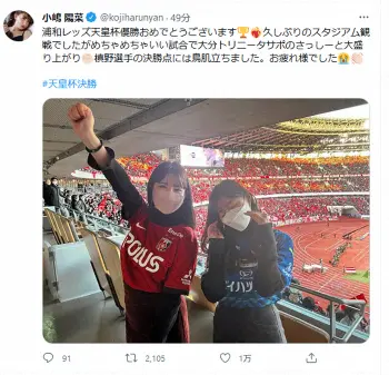 小嶋はツイッターで浦和のユニホームを着てガッツポーズ「浦和レッズ天皇杯優勝おめでとうございます。久しぶりのスタジアム観戦でしたがめちゃめちゃいい試合で大分トリニータサポのさっしーと大盛り上がり、槙野選手の決勝点には鳥肌立ちました。お疲れ様でした」と優勝を祝福した。