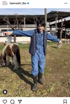同アカウントは「頑張れ唯斗」と記し、高杉のオフショット動画を投稿。ブルーのつなぎ姿に長靴を合わせた装いで、「どんな最終話になるのかラストみなさん、是非楽しみに見て下さい」とコメントしている。また、高杉の奥にはポニーが草を食べるのも見える。