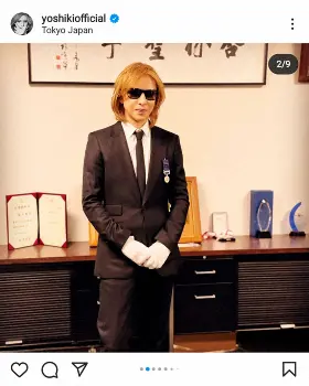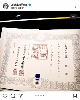 YOSHIKIは「紺綬褒章を受章しました。光栄です。親愛なるファンのみんなのおかげです」とつづり、授賞式の様子や、メダル、本名の書かれた賞状の写真を投稿。