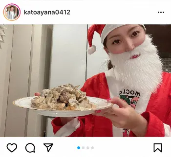 タレントの加藤綾菜(33)が26日に自身のインスタグラムを更新。サンタのコスプレ姿で手料理を披露した。