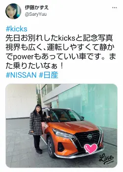伊藤は「先日お別れしたkicksと記念写真」とつづり、オレンジ色に輝く車体の“短期間だった相棒”とのツーショットを掲載。「視界も広く、運転しやすくて静かでpowerもあっていい車です」と振り返りながら、「また乗りたいなぁ!」と締めくくった。