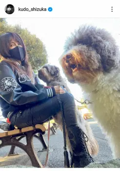 歌手の工藤静香(51)が30日、自身のインスタグラムを更新。黒のカジュアルコーデでの愛犬の散歩ショットを披露した。