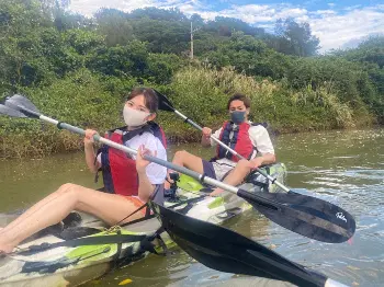 一行は、ANAインターコンチネンタル万座ビーチリゾートにある巨大な海上アスレチック、世界遺産の森に囲まれたマングローブカヤックなどのアクティビティを体験。絶景の海を眺めながらのTボーンステーキ、超高級ホテルのお正月限定スペシャルメニューなどの絶品グルメに舌鼓を打つ。
