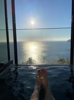 タレントで女優の辺見えみり(45)が31日までに自身のインスタグラムを更新。海から朝日が上る中、温泉を満喫しているショットを公開した。