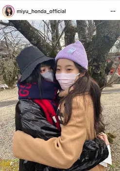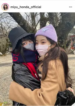 望結は「ぎゅ」とだけコメントを添え、真凜をハグする写真を2枚公開。公園で、大きな木の前で、望結は黒のハット、赤と紺のマフラー、黒のアウターを着た姿で、真凜はパープルのニット帽に、ベージュのコートを着た姿で、それぞれ防寒対策ばっちり。