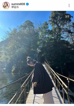 すみれは前日3日に「おいでやす~」と記すと、伊豆の温泉宿で浴衣に羽織を重ねて正座をするショットをアップ。この日は「Gratitude(感謝)」と記すと、同じ姿でつり橋にたたずむ様子を投稿した。
